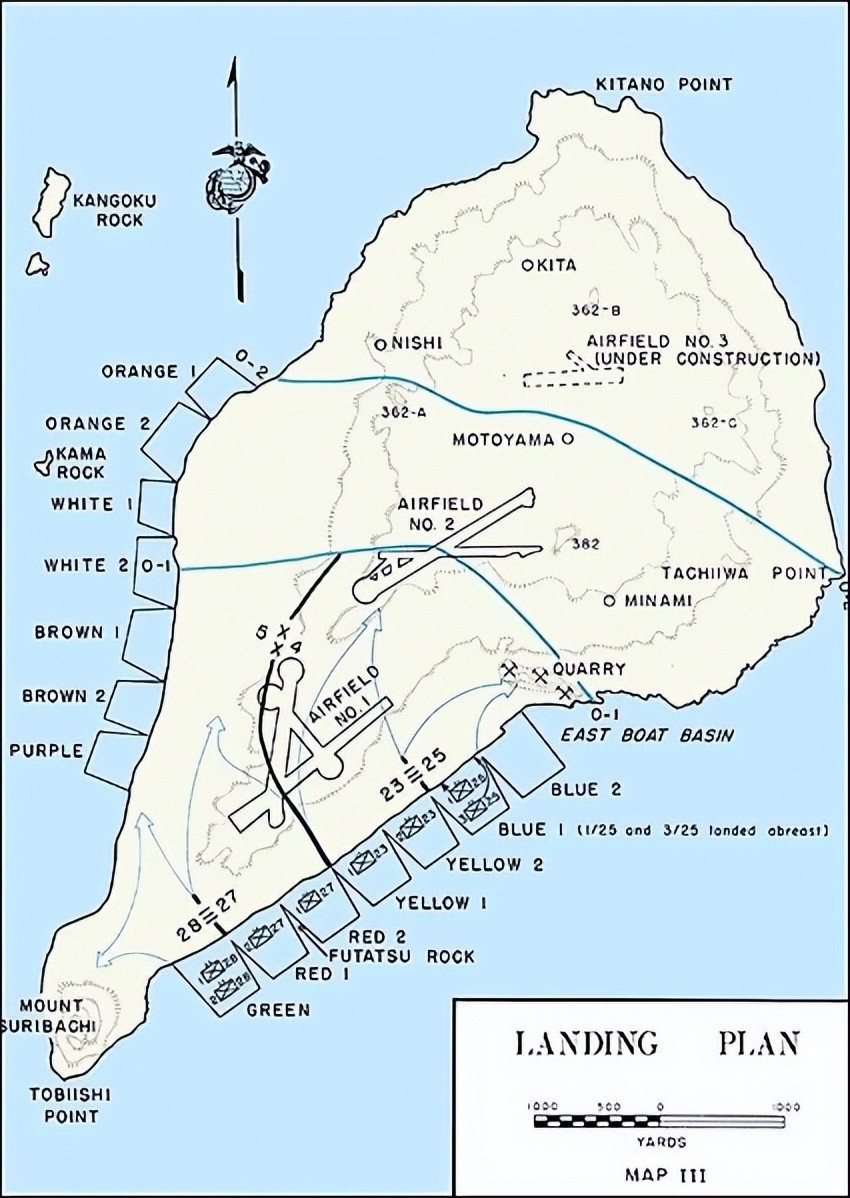 1945年2月25日,三个陆战师在硫磺岛并肩开始攻击,4师在右,3师居中,5师在左,并列向东北推进。