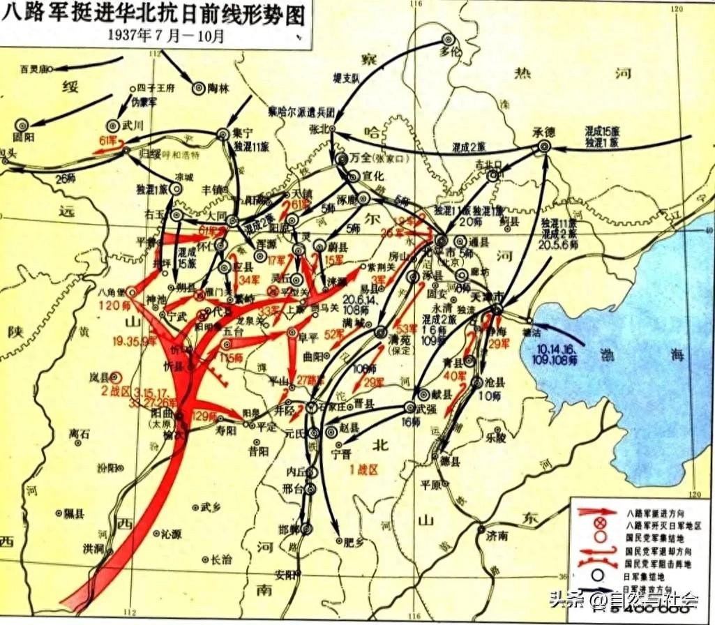 八路军挺进华北抗日前线形势 日军以第20师、独立混成第1、11旅、中国驻电军步兵旅侵占平津之后,8月中旬,关东军混成第2、15 旅及大泉支队、提支队分别到达平津与张北,与先期到达的混成第1 旅编成关东军察哈尔派遭兵团。同时,由日本国内调来的第5、6、10师也到达平津,并沿平绥、平汉、津浦三条铁路线向中国军队发起进攻。8月24日,日本再由国内派第14、16、108、109师到华北战场。为适应扩大侵略战争的需要,8月31日成立华北方面军司令部,辖第1、第2集团军,共8个师,另1个独立旅、1个临时航空兵团。至此华北兵力达30万人。