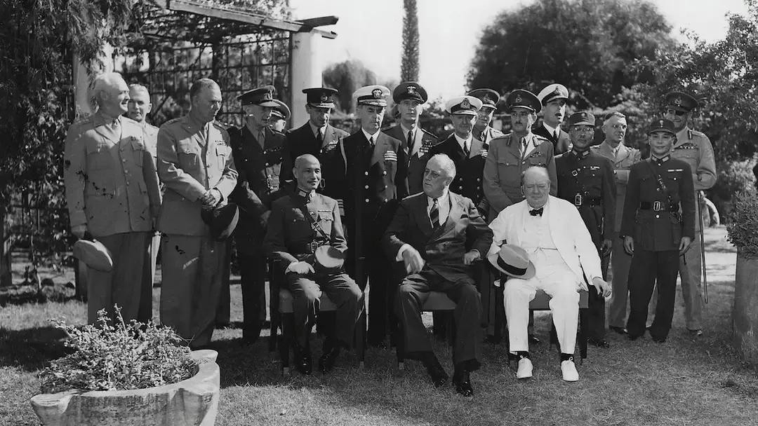 1943年,蒋介石、罗斯福与丘吉尔在埃及开罗出席中美英三国首脑会议