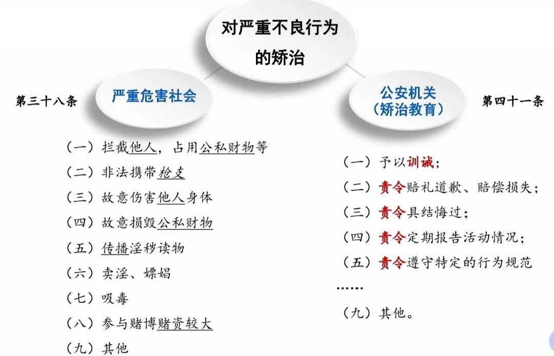 第三十八条【严重不良行为】严重不良行为,是指未成年人实施的有刑法规定、因不满法定刑 事责任年龄不予刑事处罚的行为, 以及严重危害社会的下列行为: