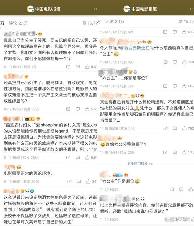 在一通 " 正义的发言 " 结尾,可能是为了抖机灵,或者表现出一些对网友的亲和,电影频道官方微博认领了坊间流传的 " 六公主 " 外号,并说:" 正义的‘六公主’也绝不接受 ",彻底将事件激化并推向高潮。