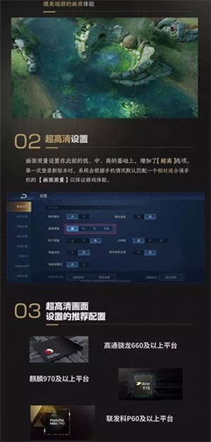 具体来说,超高清画面设置的推荐配置有:高通骁龙 660 及以上平台、麒麟 970 及以上平台、联发科 P60 及以上平台、 iOS A9 及以上平台。