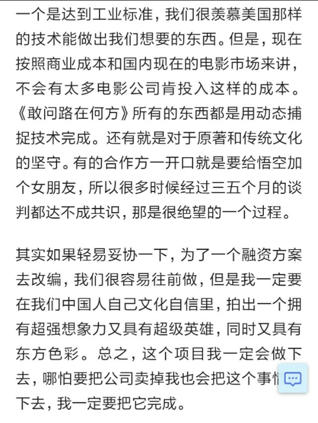 柯利明表示《敢问路在何方》一直是开机状态,该项目将被打造成真正意义上的工业电影,也因此前期筹备花费大量时间。该片将以动态捕捉的形式完成表演,而不是只是依靠CG。