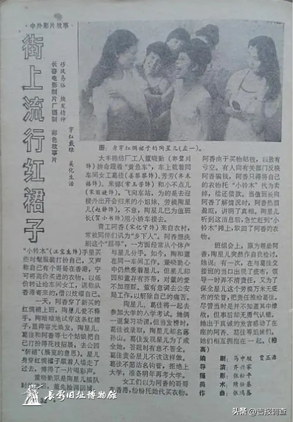 长影拍摄的彩色故事片《街上流行红裙子》由贾鸿源、马中俊编剧,齐兴家执导,赵静、姜黎黎、宋忆宁、贺小书、郭碧川、葛存壮等主演。影片通过1980年代上海青年纺织女工陶星儿、葛佳、阿香等人的生活,展现了她们多姿多彩的精神世界和改革潮流中的上海社会风情。值得一提的是,片中的主题曲《金梭和银梭》十分受欢迎,朗朗上口的轻快曲调和歌词,让其成为当时风靡全国的热门流行歌曲。“太阳太阳像一把金梭,月亮月亮像一把银梭……”只要旋律响起,总会有人跟着哼唱下去。