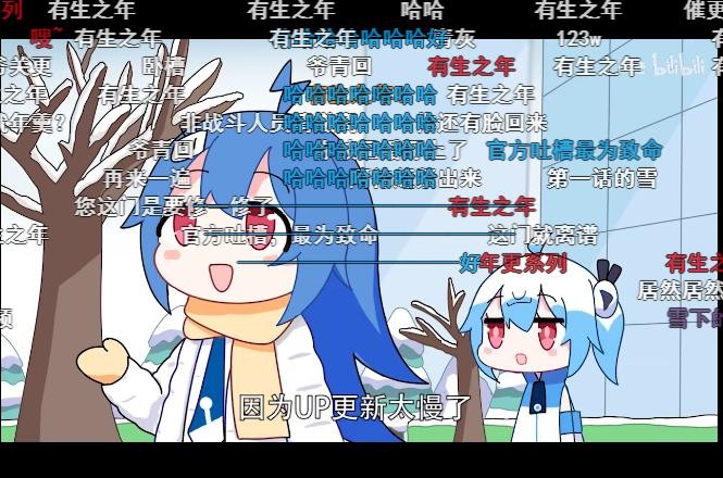 开场22娘跑出B站总部大楼发现外面下雪了,表示怎么又下雪了,上次见面的时候还很热来着,33娘跑出来吐槽说:‘因为UP更新太慢了!’果然官方吐槽最为致命!