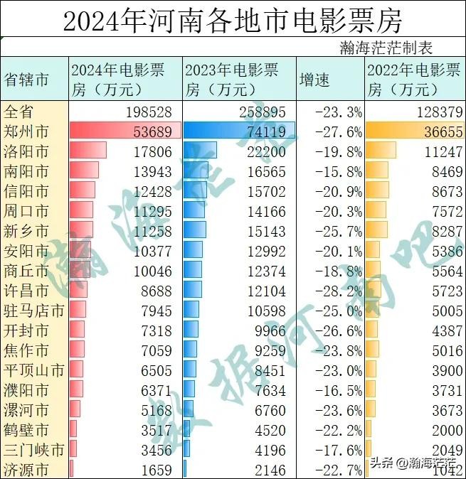 2024年河南省各地市电影票房及变化,全部出现负增长