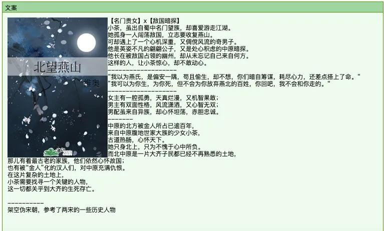 看得出来作者以分崩离析的宋家天下为背景写的文章。“遗民泪尽胡尘里,南望王师又一年”。燕云十六州缺席了汉族王朝的正史四百多年,却很少有人去写燕云十六州的故事。