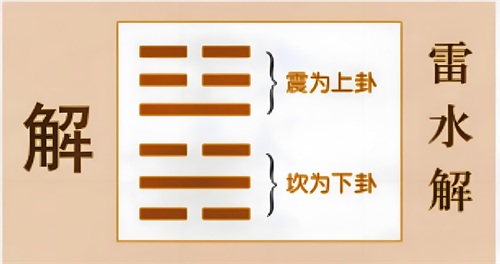 (21)六十四卦之一。坎下震上。《易·解》:“解,利西南。”孔颖达疏:“解者,卦名也。然解有两音,一音古买反,一音胡买反。”陆德明释文:“解,音蟹。”