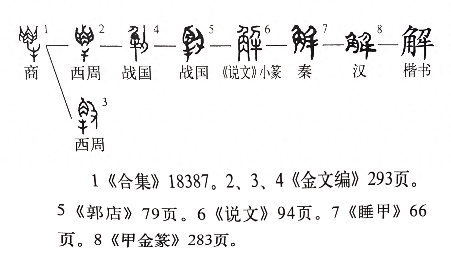 甲骨文即金文字形均作双手(臼)执牛角状,从臼,从角,从牛。表示判解牛角之意。至战国时期,双手演变为“刀(或刃)”部,使字义更加显明,就这是后来篆、隶“解”字的字形来源。