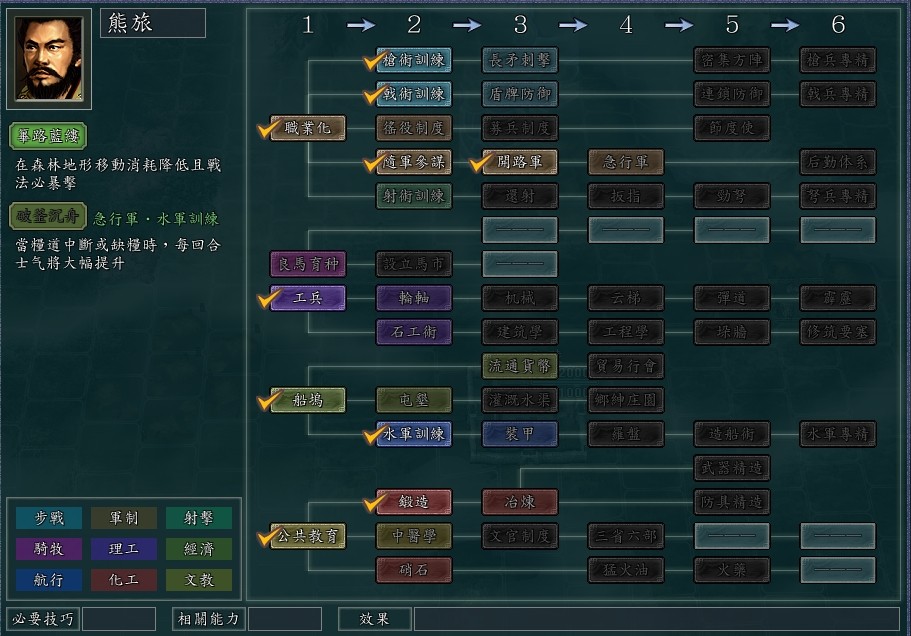 专属科技一“筚路蓝缕”:在森林地形移动消耗降低且战法必暴击。