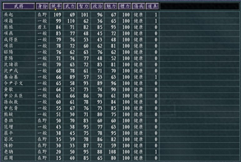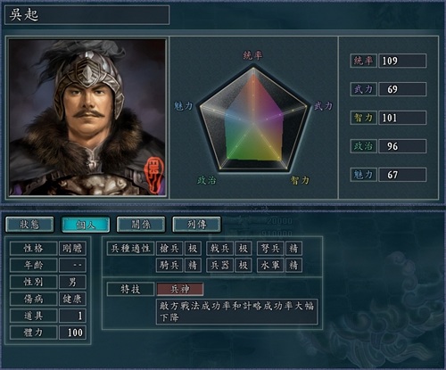 而且吴起虽然适合带一堆防御人物,但是,本身高达109的统率值,位居全人物第二位,即便是硬属性带来的攻击能力,都不可轻视。