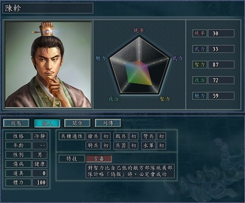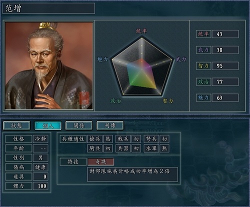 亚父范增拥有95点智力值,特技“奇谋”可以提升一倍的计谋成功率。这个特技虐菜还可以,但是碰见智力相近的硬茬子就不好使了。不过好在吴起还有个可以增加计谋成功率的智力光环,多少可以使范增的作用更大一些。