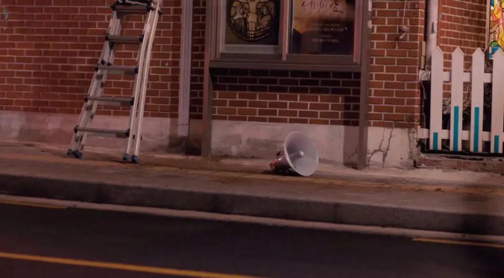 而当丈夫被反杀,静霞路过基督教教会,唱着圣歌的喇叭突然坏了并掉落,去强调了二者的同一性,暗示父权如信仰般的至上地位。