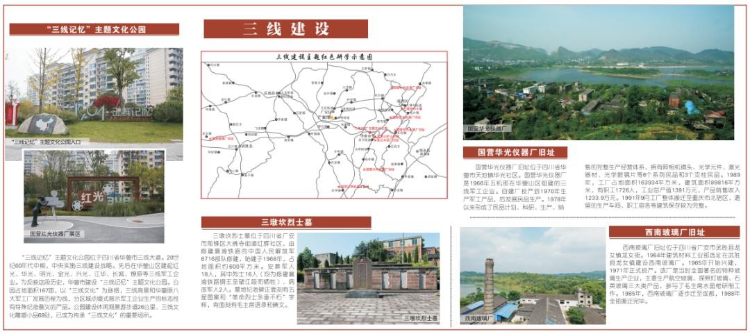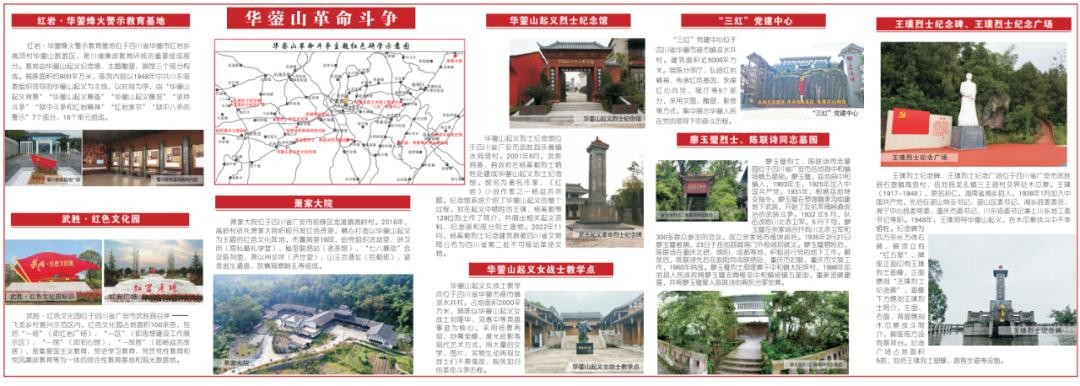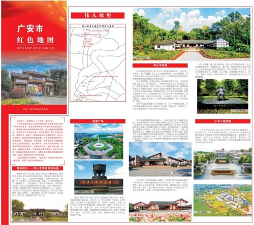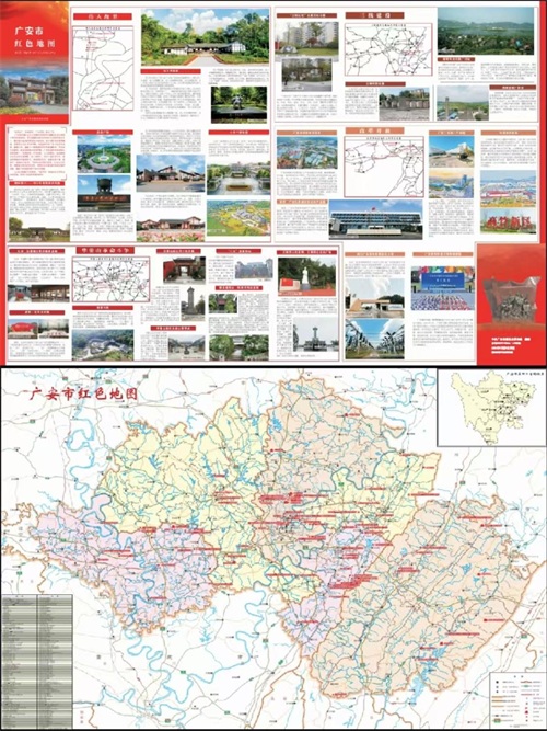 《广安市红色地图》详细标注了新民主主义革命时期、社会主义革命和建设时期、改革开放和社会主义现代化建设新时期、中国特色社会主义新时代广安市内重要红色地标82处,设置了伟人故里、华蓥山革命斗争、三线建设、改革开放4条主题研学线路,使红色资源串珠成链、红色文化连线成面,为全市党员干部群众学习了解区域红色资源提供便利。