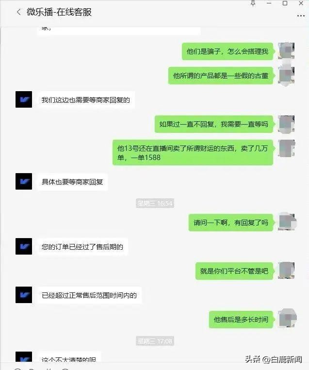 4月30日,记者再次联系微乐播平台客服,工作人员说,他们只售后,根据订单联系商家协调退费,至于监管一概不了解。那对“雷总直播间”及其背后公司资质是否核查,合不合规?工作人员说,想退费也可以直接找直播间对应公司客服,商家合不合规他们不处理。