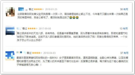 在刘锦玲的演绎下,阿朱楚楚可怜又忠肝义胆,对乔峰爱之深令人动容。可以说是这一版《天龙八部》中最让人难以忘怀的角色。网友也纷纷肯定刘锦玲版的阿朱,称她是最真善美的一位天龙女性。她与乔峰的爱情悲剧,真是让观众们包括小8不由得潸然泪下。