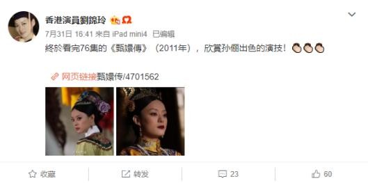 但刘锦玲还是开通了微博,时常分享她的生活。比如做做手工、读读书。她还在微博上盛赞孙俪演技,称自己已经看了好多遍《甄嬛传》,俨然一位资深迷妹。