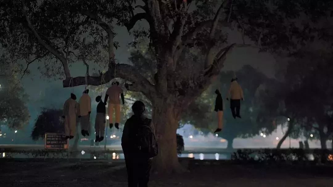 一群警察简单庆功,只有一个悲观的小姑娘不说话,抬头看着什么。直到其他人都走了之后,镜头一下切到她背面,六具吊树上的假人猛地出现,事实上,它们一直都存在着,只是一直被无视。