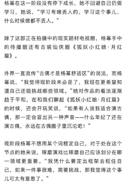 在谈及新剧《妖狐小红娘》时,杨幂坦言,虽然古装偶像剧(古偶)给她带来了很多关注和喜爱,但她并不想被这一标签所框定。