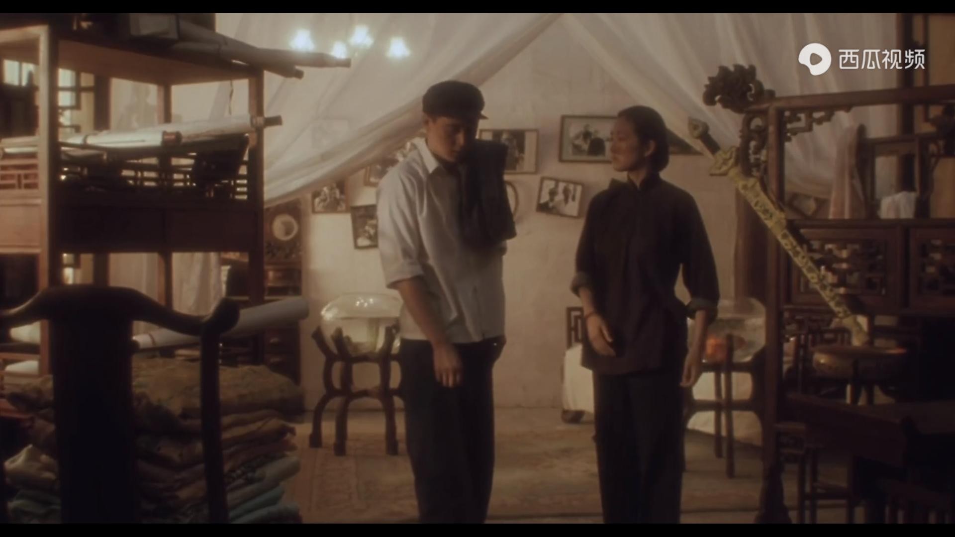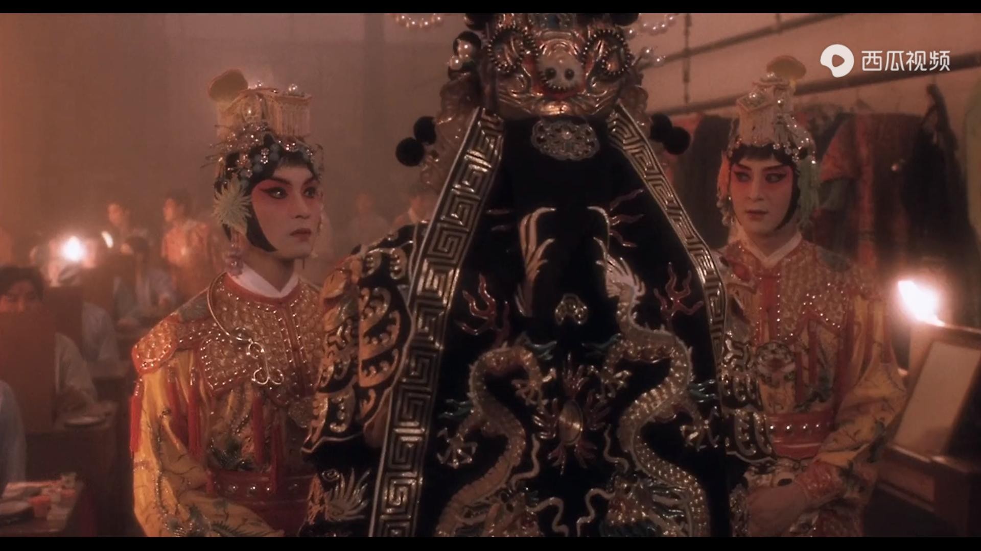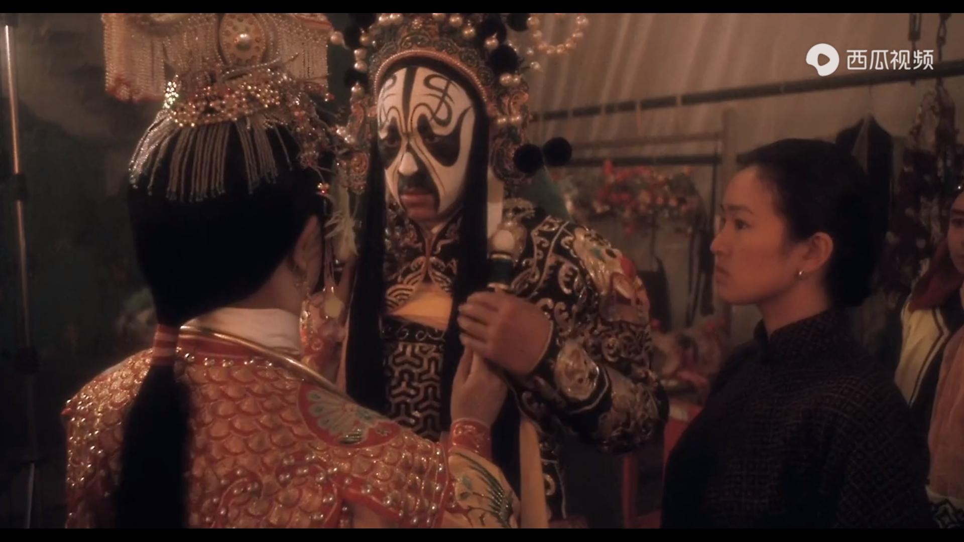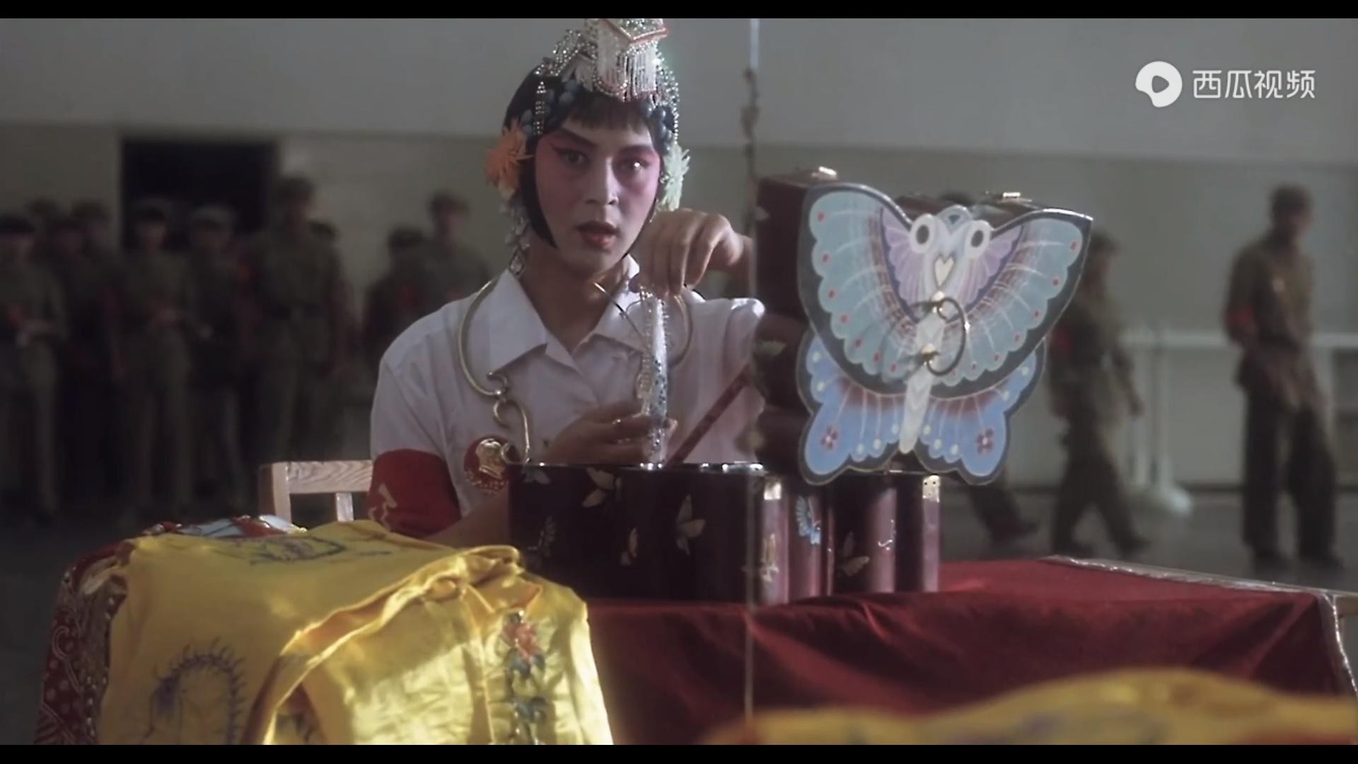 当小四满怀欣喜地打开师傅的首饰匣,扮成虞姬的样子,唱着《霸王别姬》,还没唱几句,就被红卫兵发现……戏中的唱词“四面楚歌”,讽刺般地影射着小四的结局。