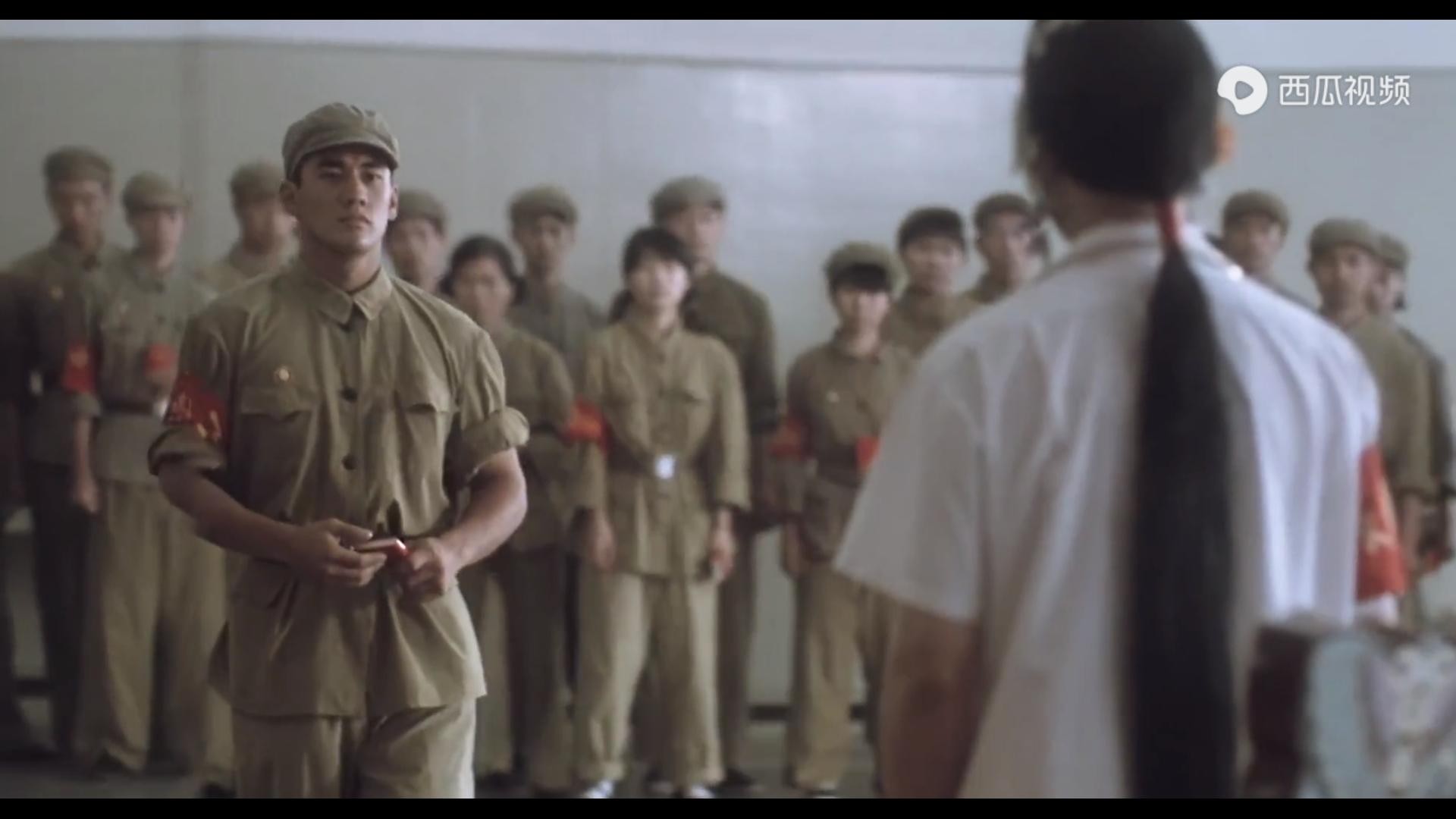 小四在红卫兵的队伍里添油加醋,他以一副正义的姿态,眼看着自己的段师傅被折磨,被压迫。当段小楼和程蝶衣开始相互揭发的时候,小四的表情开始长长得舒缓,他终于听到、看到自己梦寐以求的画面了,他的两位师傅最终将两败俱伤。