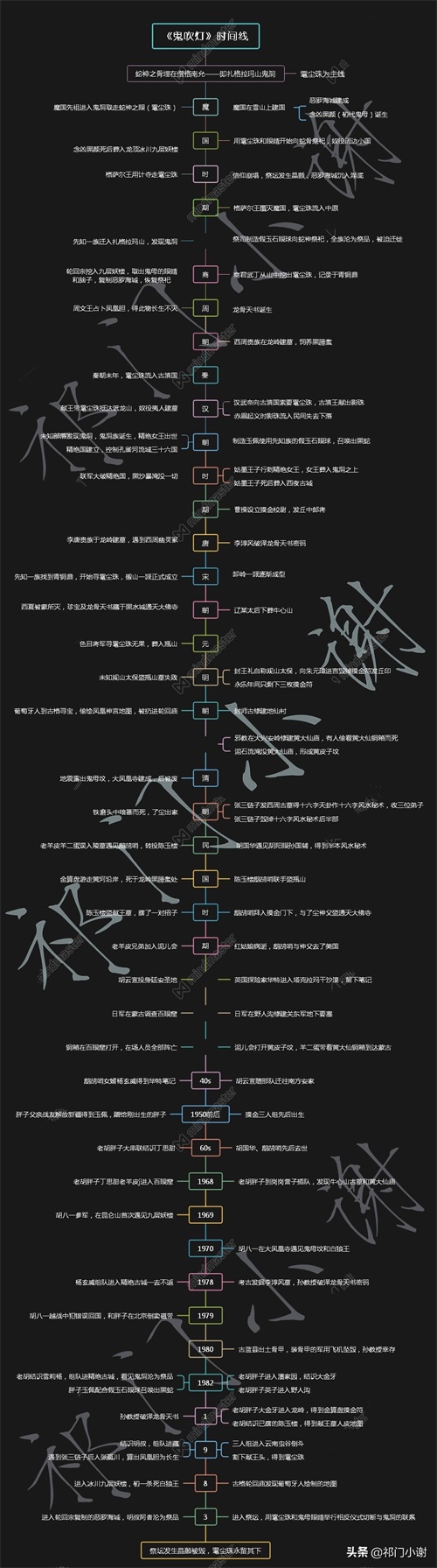 最近《龙岭迷窟》热播,小谢就又又又又把《鬼吹灯》看了一遍,结合各路大神的分析文章,小谢花费两天时间做出了这张时间轴,有助于大家了解雮尘珠的前因后果。