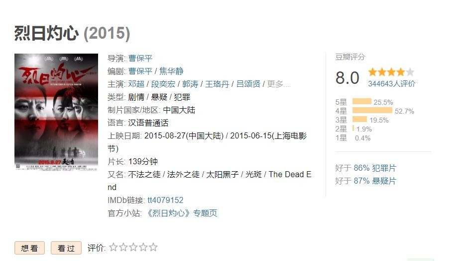 大陆警匪片公认的经典《烈日灼心》,评分堪堪8.0.