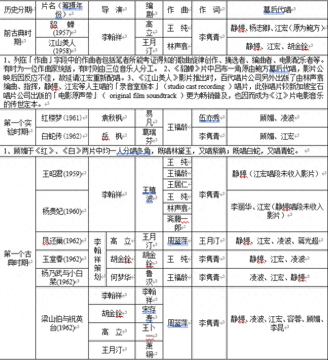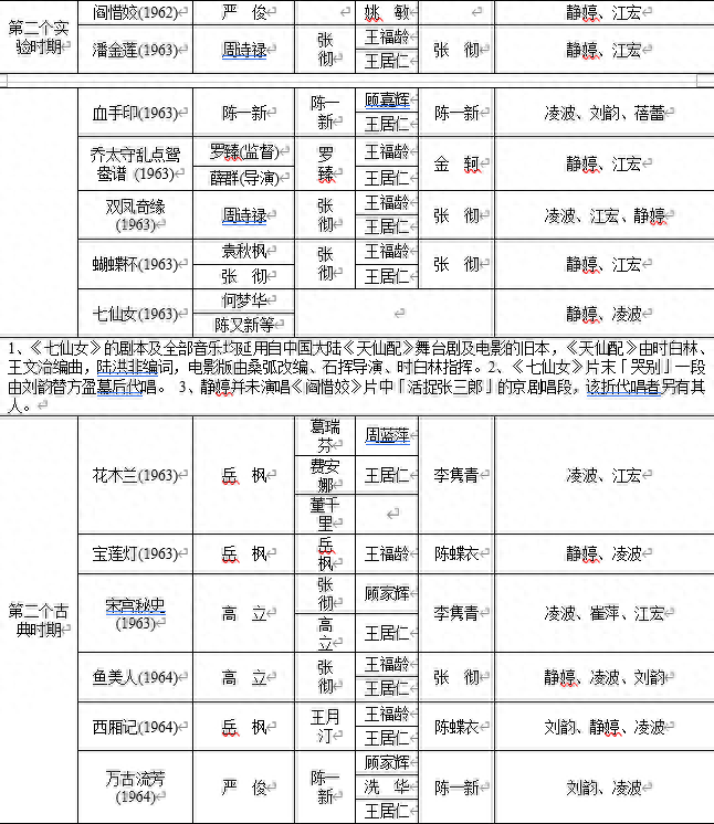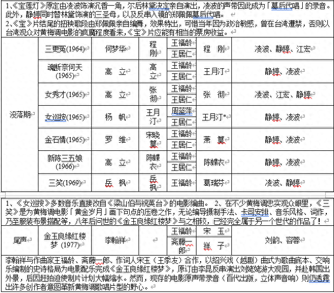 在上表中,陈炜智先生把邵氏生产的31部黄梅调电影分成了七个阶段,可谓详尽之至。表中提到的所谓“实验时期”、“古典时期”的分法都是和李翰祥休戚相关的。大体上说邵氏生产的黄梅调电影基本上可以分成两类,李翰祥在邵氏期间创作、包括其弟子们创作的黄梅调电影基本上都属于比较一致的“李氏风格”;到1963年李翰祥离开邵氏赴台湾自组“国联”以后,高立、岳枫等导演成为邵氏黄梅调电影的创作主力,此后的黄梅调电影在题材、风格方面均有所变化,整体上有一个由古典文学向稗官野史略微转向的趋势,艺术水准一般来说也确不如“李派”黄梅调电影来的精湛。到1966年这股黄梅调电影热潮可以说已经走到了终点,这以后原先拍摄黄梅调电影的高立、岳枫等人迫不得已也跟着转向了武侠片创作。自1966年以后邵氏生产的黄梅调电影只有两部,一部是岳枫导演的《三笑》(1969),一部是数年之后李翰祥导演、由林青霞和张艾嘉主演的《金玉良缘红楼梦》(1977)。李版的《红楼梦》作为古装片来讲精美不减当年,但是在韵味方面和早期的黄梅调电影相比已经可以说是相异其趣。