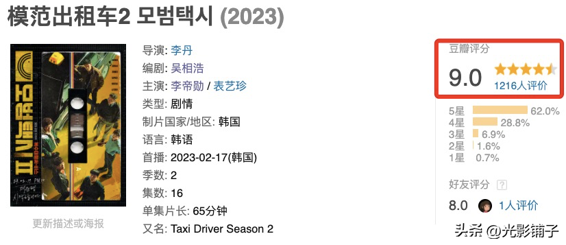 期盼已久的《模范出租车》第二季终于来了,首播2集在韩国收视率高达12.1%,而在豆瓣评分也飙到9.0分,超过90%的人给出了4星或5星好评,爆款剧无疑了。