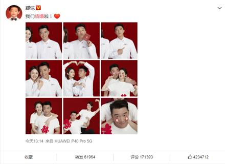 今天13点14分郑恺和苗苗同时在微博更新结婚的好消息,同时还上传了两人甜蜜的九宫格结婚照,并附文“我们结婚啦!”。照片中郑恺苗苗笑容灿烂,时而搞怪可爱,时而甜蜜比心,时而嘟嘴卖萌,看上去既温馨甜蜜又逗趣可爱,不得不说郑凯和苗苗真是一对“活宝”,郎才女貌天造地设的一对。