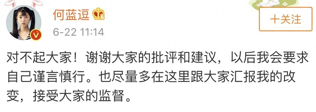随后,何蓝逗也在社交媒体上发文为自己的言行举止道歉。