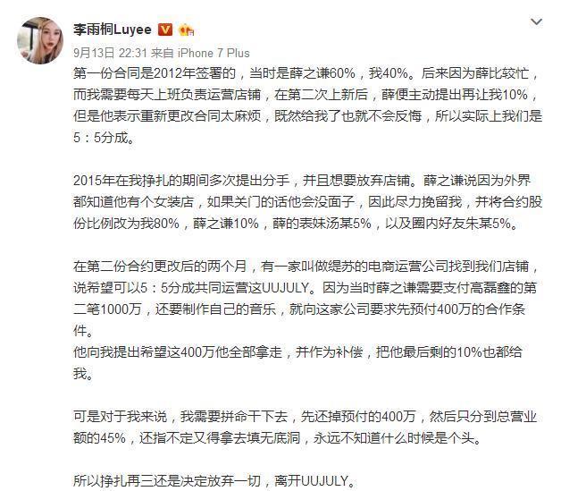 李雨桐:我们合开UUJULY,我辛苦赚的钱,填补你前妻的无底洞,你却向大众说即使自己净身出户,也要深情款款地要给前妻凑齐1000万离婚费。对呀,1000万,2000万,你当你的深情前夫,我默默为你填洞,你还要我怎样,要怎样……