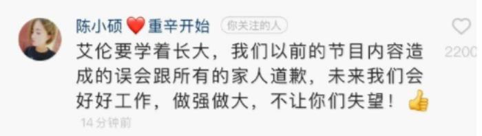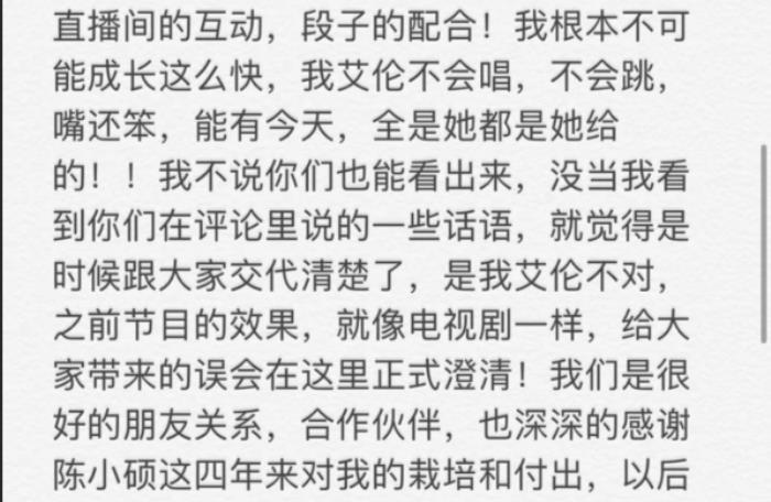 陈小硕和团队的男徒弟艾伦以前直播时频繁秀恩爱,办活动时还穿婚纱官宣什么的。昨天艾伦发作品澄清与陈小硕并非情侣关系,一直以来只是直播效果,跟电视剧一样。给大家带来的误会正式澄清,我们是很好的朋友,合作伙伴,以后会好好工作不辜负她对自己得期望。陈小硕也在下方评论道歉。