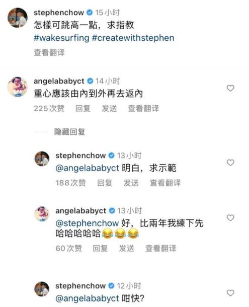 随后,Angelababy与周星驰在评论区互动,两人认真讨论冲浪,baby细心点拨,星爷虚心表示:“求示范”,Angelababy回复:“给我两年时间练下先!”