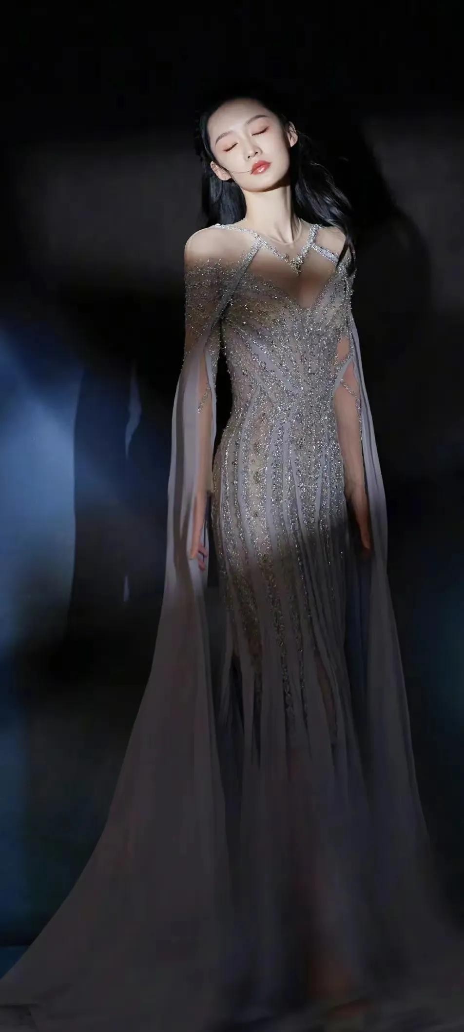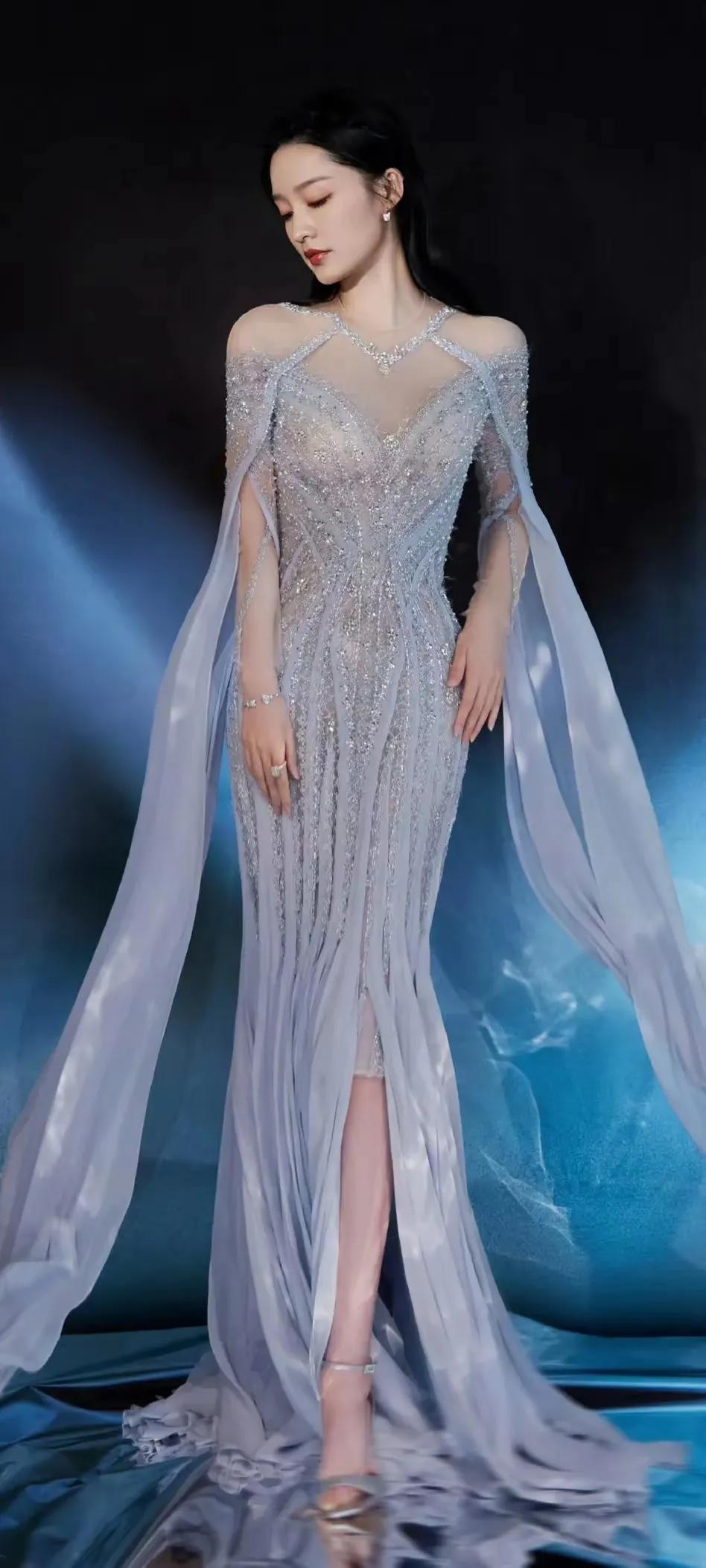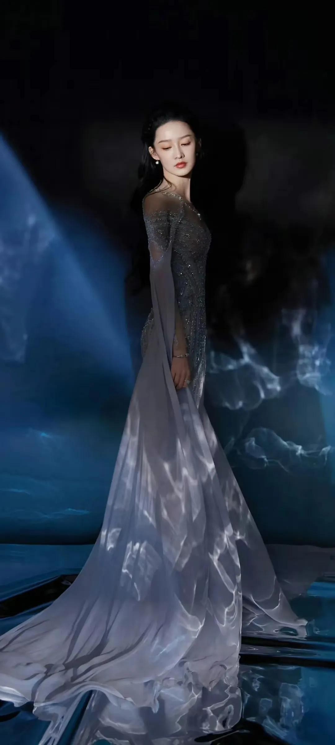李沁是我心中的女神,尤其她身着一袭优雅的长裙,仿佛从梦境中走出的仙女。她的礼服上半部分采用银色透视设计,点缀着细腻的亮片,闪烁着神秘而高贵的光芒。裙摆则是纯洁的白色,随着她的步伐轻轻摇曳,如同波浪般柔美。背景中的蓝色光影与她的礼服形成了鲜明的对比,营造出一种梦幻般的氛围。
