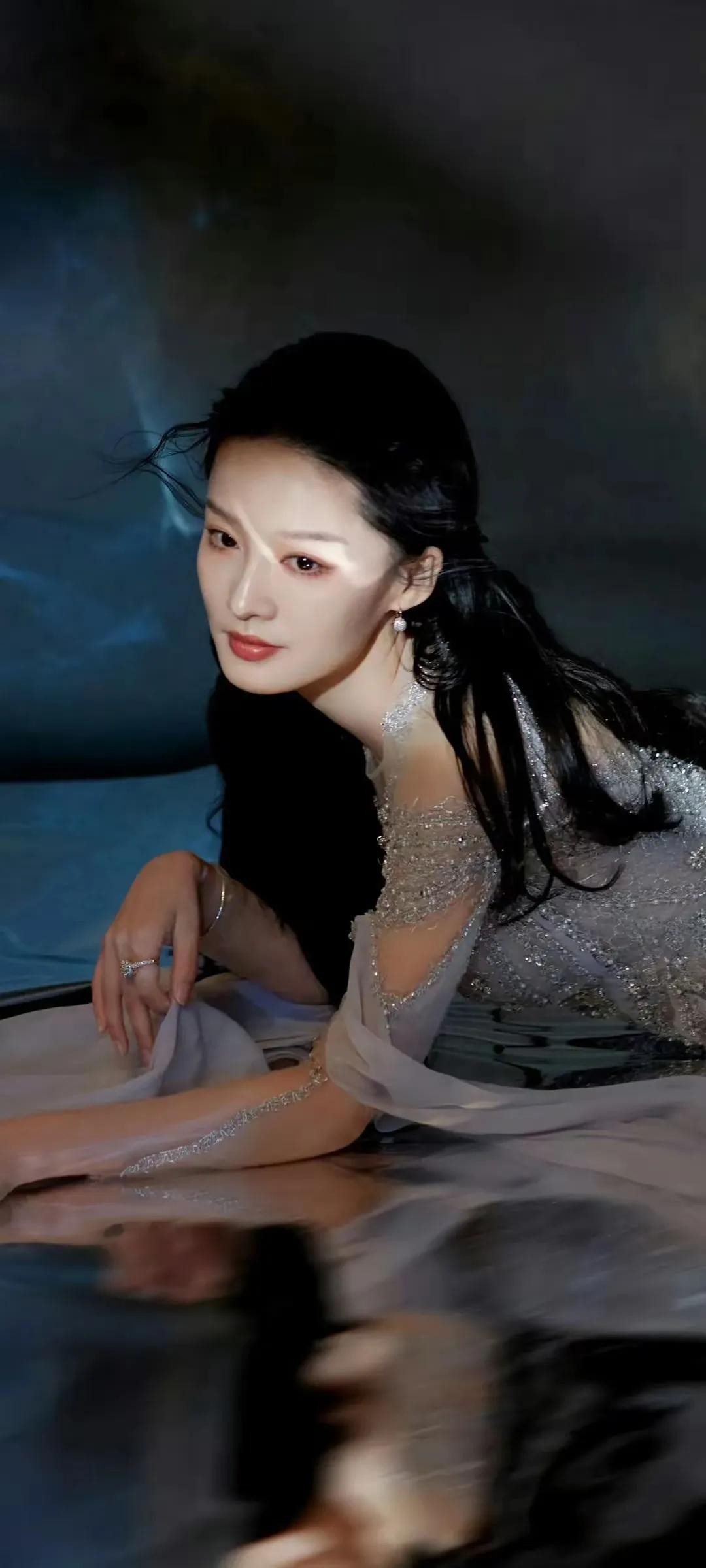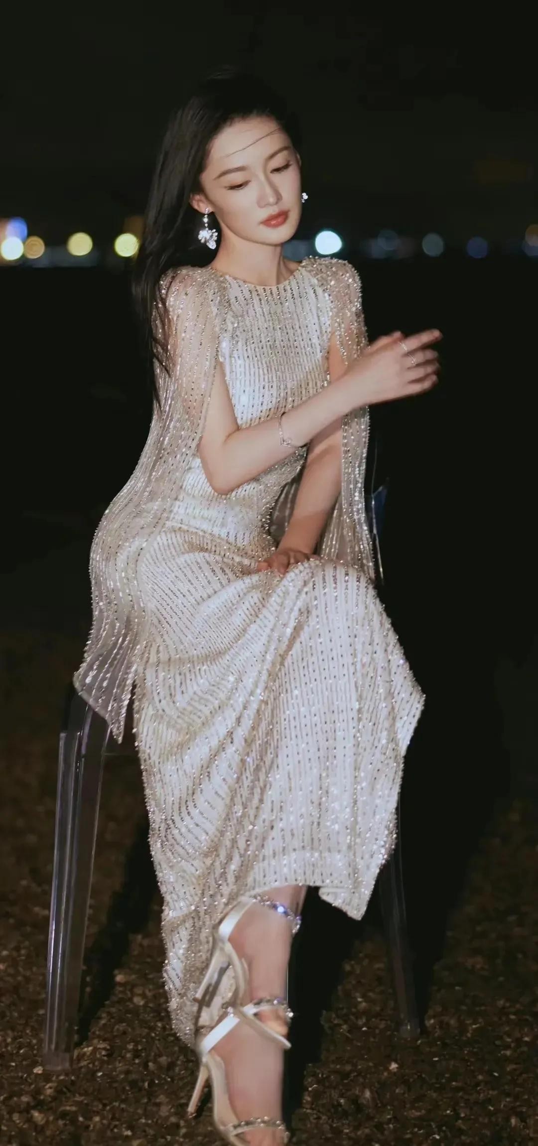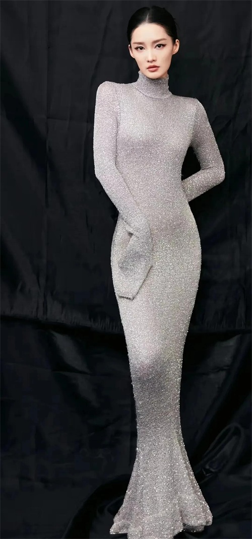 李沁是我心中的女神,尤其她身着一袭优雅的长裙,仿佛从梦境中走出的仙女。她的礼服上半部分采用银色透视设计,点缀着细腻的亮片,闪烁着神秘而高贵的光芒。裙摆则是纯洁的白色,随着她的步伐轻轻摇曳,如同波浪般柔美。背景中的蓝色光影与她的礼服形成了鲜明的对比,营造出一种梦幻般的氛围。