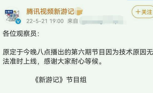 1、《新游记》第六期没播是因为技术问题,导致节目暂停播出,后续播出时间等待官微官宣。5月22日第六期《新游记》没有按时播出,官微发声明是技术问题。