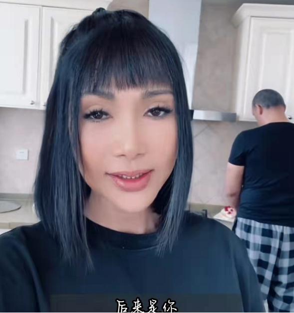 她的老公身穿黑色上衣站在后面,低头专心切蛋糕。他身形壮硕,有些头发已经变白了,保养得没有老婆好。