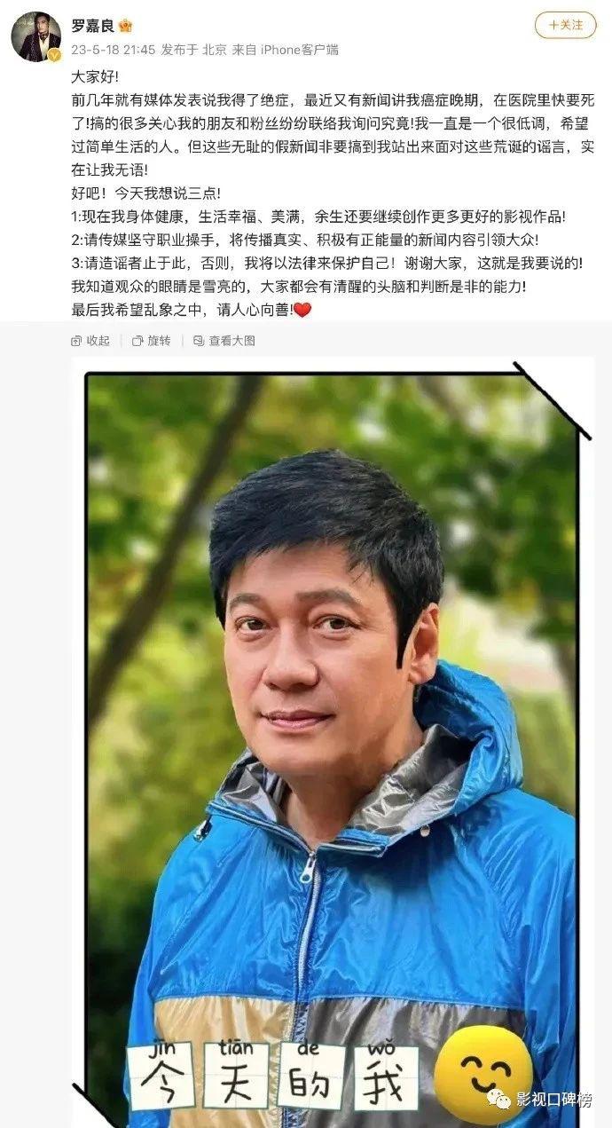 没办法,逼的罗嘉良本人出来澄清辟谣这则消息,晒出来了一张现阶段的自拍视频,表示他身体健康生活幸福,而且还在积极工作中,并且宣布如果再有类似的假消息,会对这些不良的造谣媒体拿起法律的手段进行抨击。