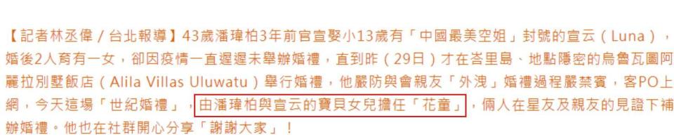 据悉,潘玮柏老婆宣云是一位空姐,比他小13岁,早在20年7月潘玮柏就对外宣布两个人已经领证结婚,随后被曝生下一女,但到现在夫妻俩都没有承认有孩子一事,而对于此次在巴厘岛补办婚礼的两个人,台媒报道称女儿担任花童。