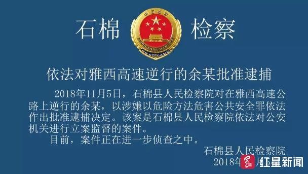 11月5日,雅安市石棉县人民检察院发布消息,对在雅西高速公路上逆行的余某,以涉嫌以危险公共安全罪依法作出批准逮捕决定。该案是石棉县人民检察院依法对公安机关进行立案监督的案件。目前,案件正在进一步侦查之中。