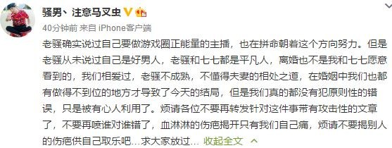 那么骚男呢,在昨晚离婚这一说法曝出之后骚男在接近凌晨1点的时候也发微博作出了回应