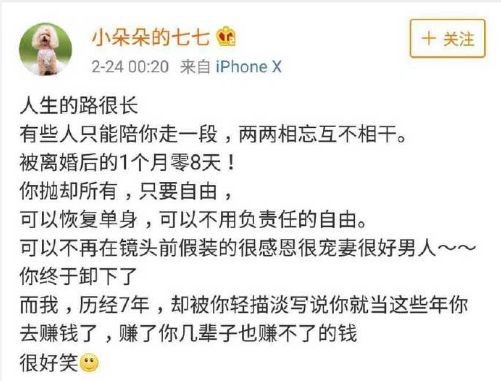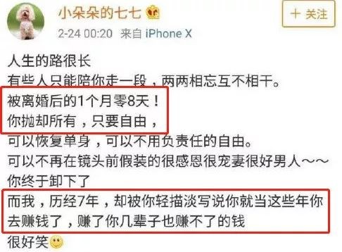 总结一下大概就是在说骚男抛弃了和他同甘共苦的妻子,宠妻好男人只是人设,七七认为自己的7年时光是无法用钱弥补的。