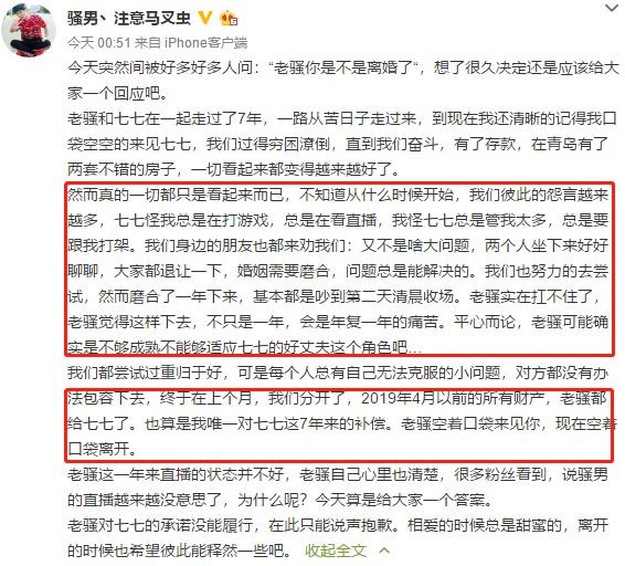 骚男回应称自己确实和七七离婚了,两人在一起走过了七年,但还是因为彼此之间磨合不来走向了离婚。骚男选择了净身出户,将19年4月之前的所有财产都给了七七。小见见了解了一下,两套房产加上八位数的现金,骚男选择放弃的财产大概有数千万。