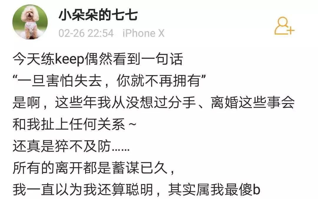 原本这件事呢小见见觉得既然没有提到出轨家暴等证据……那就是两个人之间的问题。据七七在2月份的微博说的“耗时4月”可以推断,双方起码在18年10月就因为磨合不来产生离婚念头,然后在今年年初选择了离婚,并在上个月走完了相关手续。