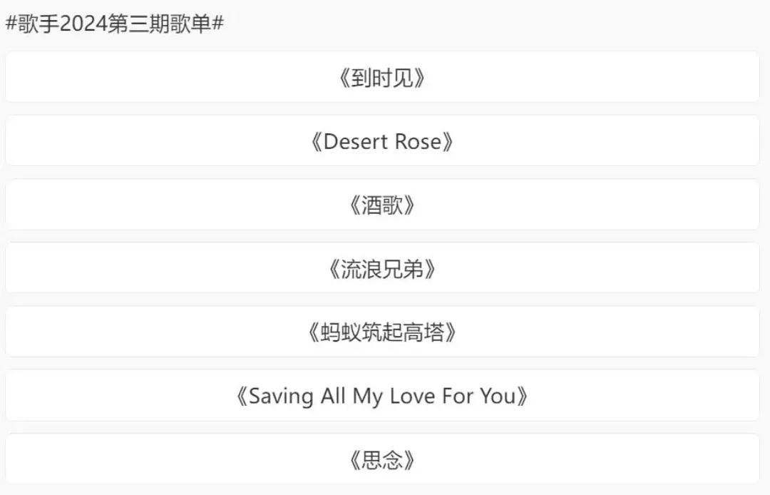 2024歌手栏目组公布了第三期的竞演歌单,每一首都独具特色,让人期待不已。