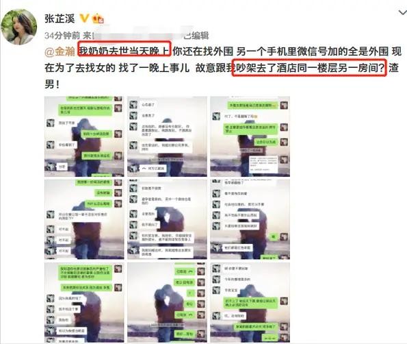 这不,前两天张芷溪在微博自曝男朋友金瀚在奶奶去世那天找外围。