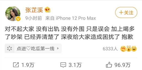 就算张芷溪大骂金瀚渣男,但事情很快就发生了戏剧性反转。张芷溪这边不仅迅速将这条微博删除,而且还在第二天上午发布了道歉声明。