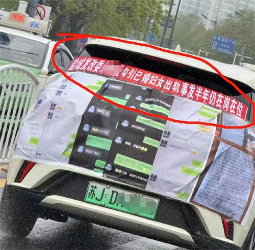 但他等了8个月不仅没有得到回应,而且这位90后处长仍在岗位上任职。走投无路的公公,只能将这些聊天记录,开房记录以及保证书打印成条幅,贴在车尾处在各个街道穿梭传播。