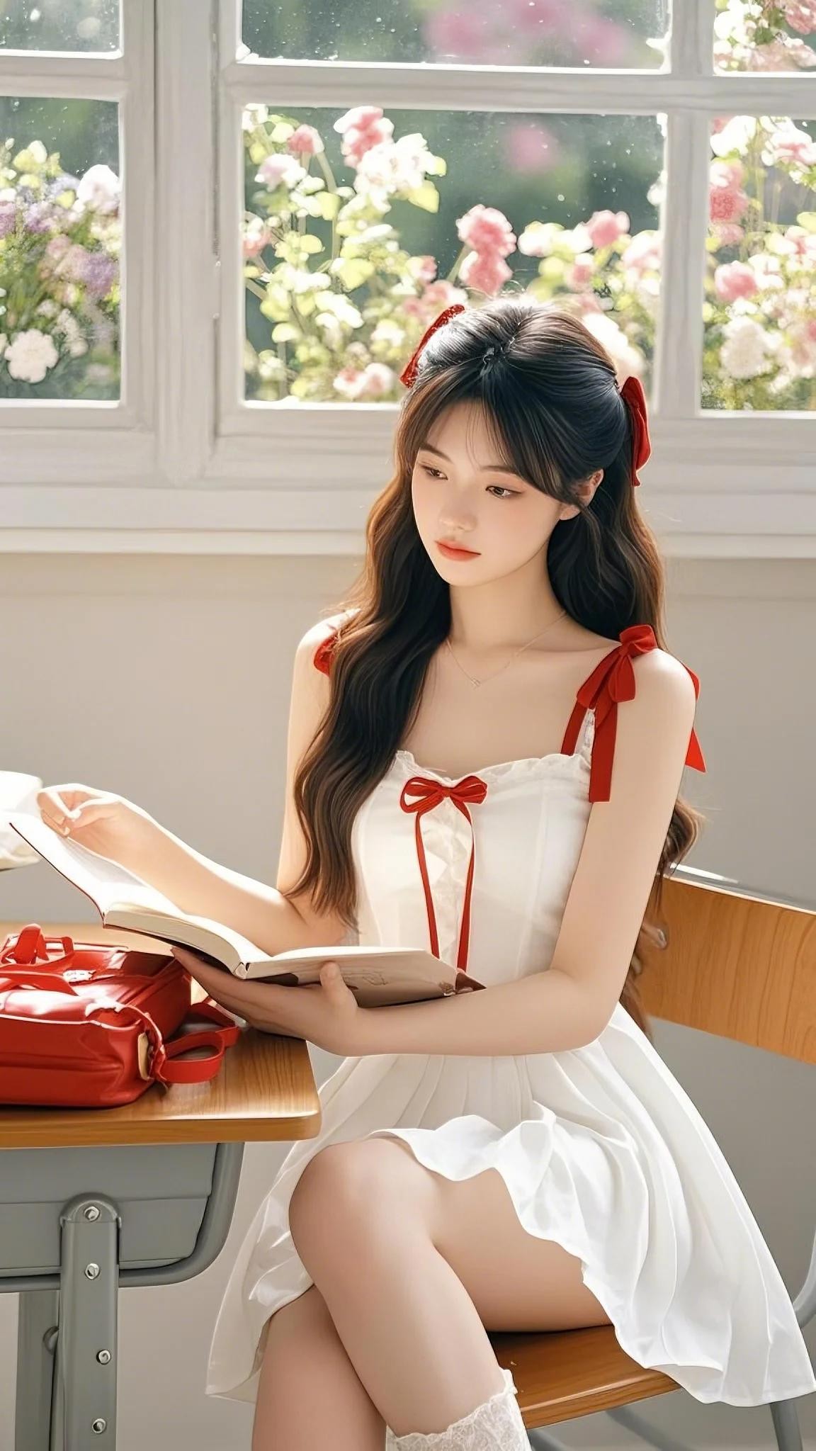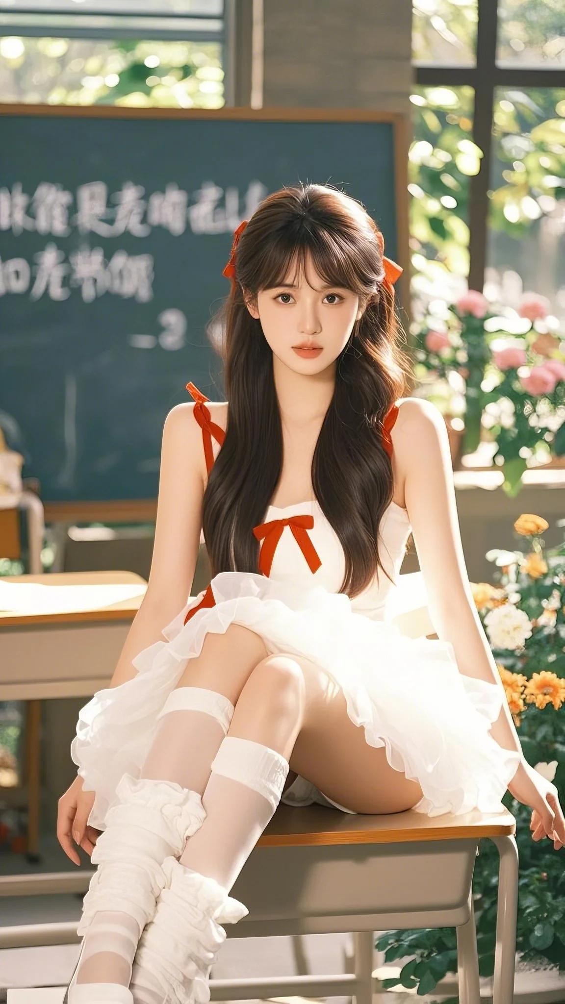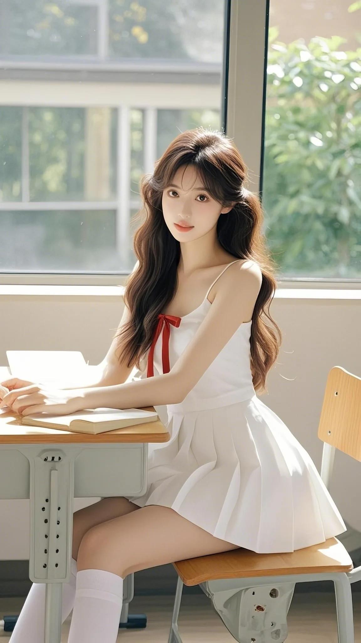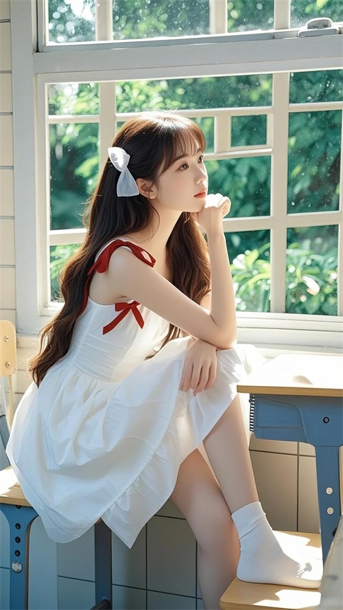 记忆里,校园教室中,她身着一袭白色的吊带短裙,裙上饰有明艳的红色蝴蝶结。她拥有一头修长靓丽的秀发,自然垂落,风轻轻的吹着,发丝随风飘舞,撩动少年的心。